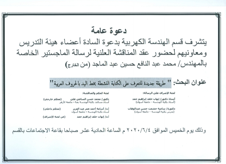 يتشرف قسم الهندسة الكهربية بدعوة السادة أعضاء هيئة التدريس ومعاونيهم لحضور عقد المناقشة...