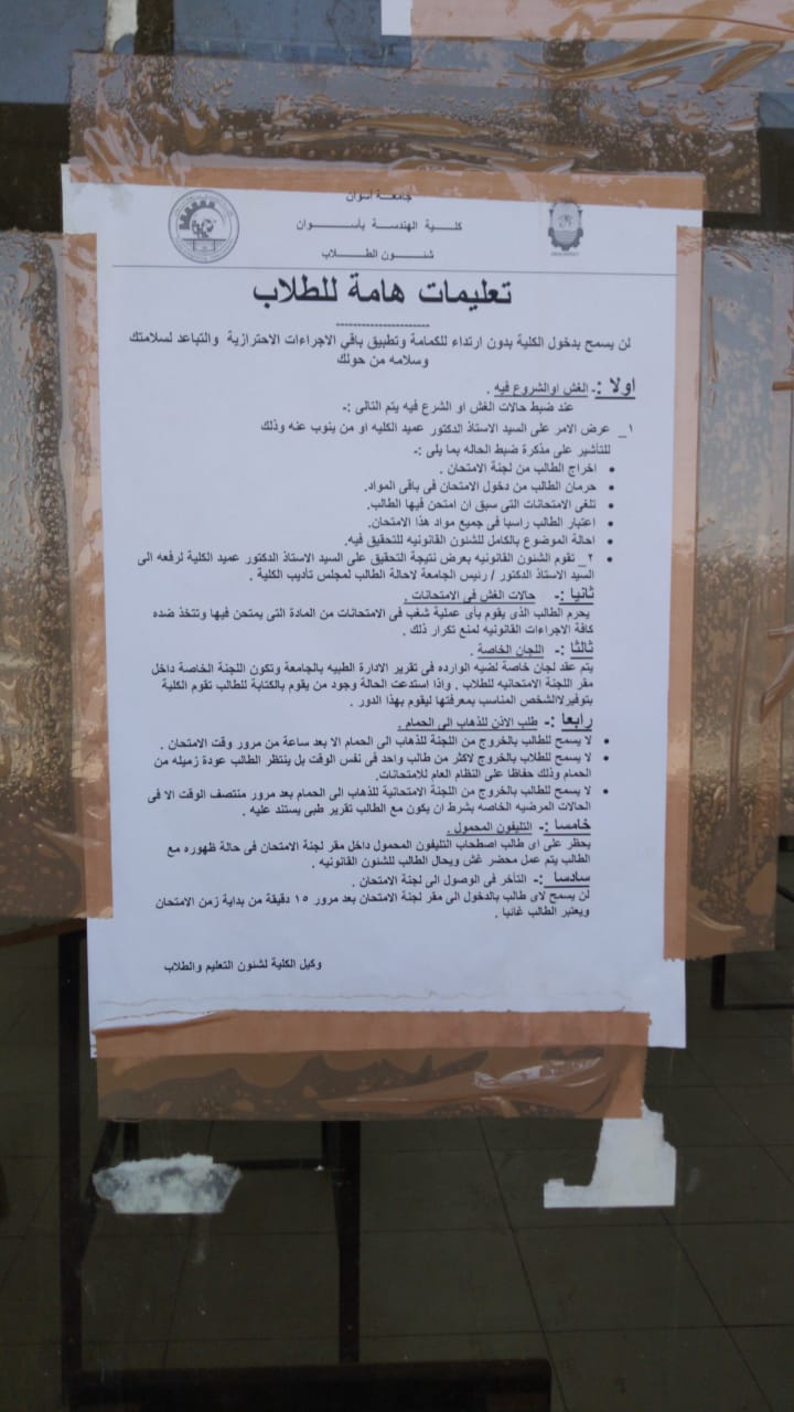 بناءا على توجيهات الاستاذ الدكتور /لؤى سعد الدين – استعدت كلية الهندسة بكامل التجهيز والتعقيم للكلية لامتحانات الفرقة الرابعة (بكالوريوس) وذلك للحفاظ على سلامة الطلاب