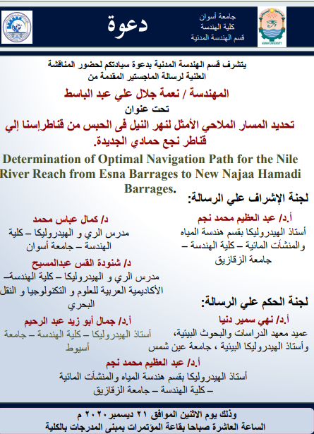 يتشرف قســـم الهندســة المدنيــة بدعـــوة حضراتكم لحضورالســيمنار المناقشة العلنية لرسالة الماجستير المقدمة من المهندسة /...