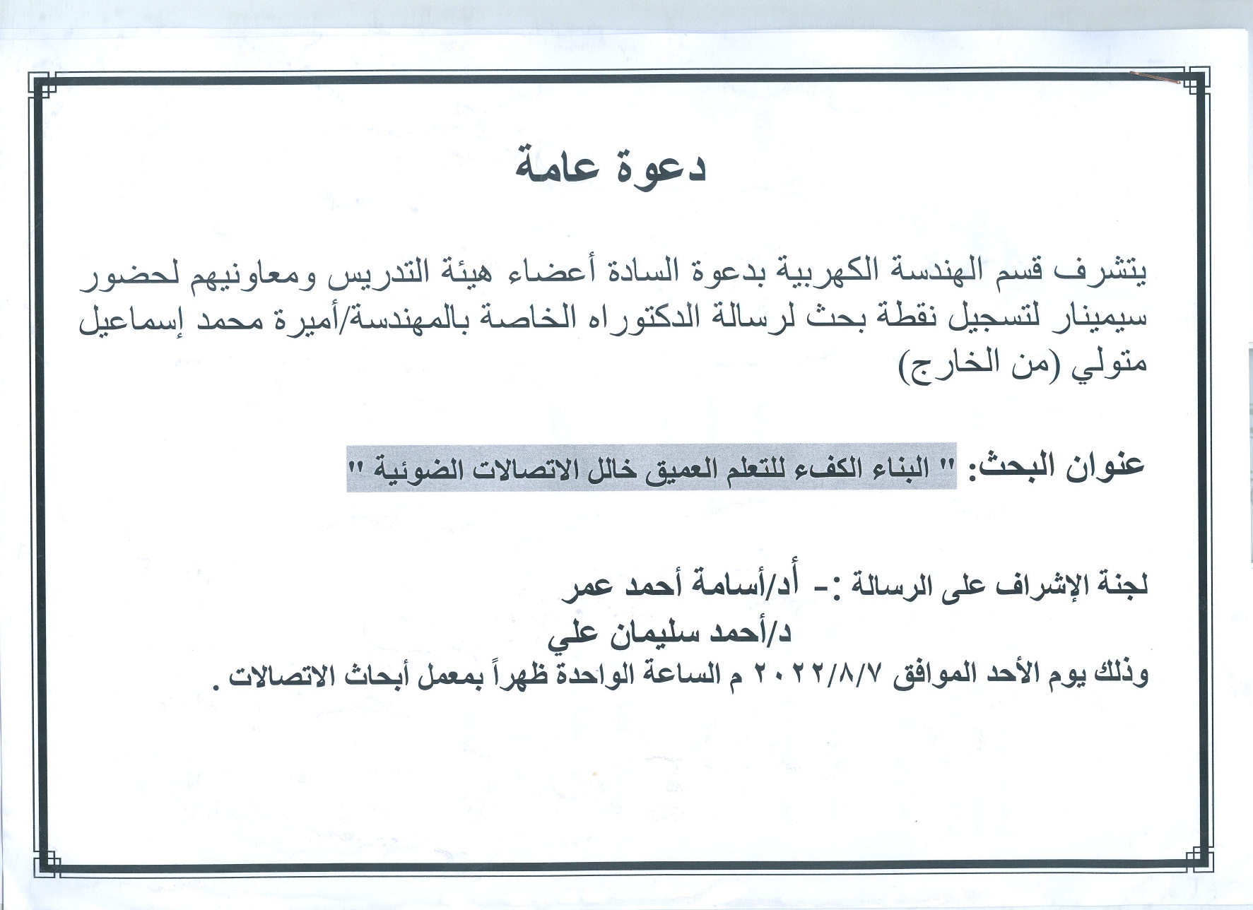 وذلك يوم الأحد الموافق 2022/8/7 م الساعة الواحدة ظهراً بمعمل أبحاث الاتصالات .