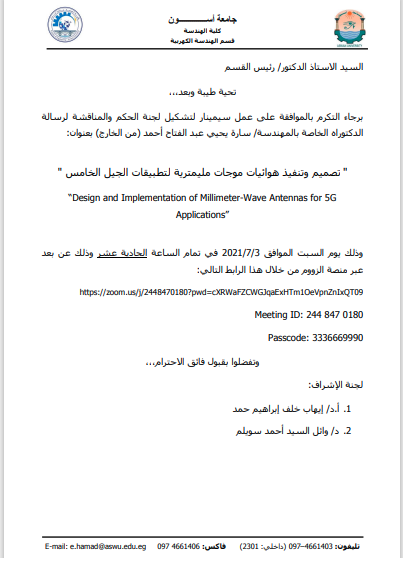 يتشرف قسم الهندسة الكهربية بدعوة السادة أعضاء هيئة التدريس ومعاونيهم لحضور سيمينار لتشكيل لجنة الحكم والمناقشة لرسالة الدكتوراه الخاصة بالمهندسة / سارة يحيي عبد الفتاح أحمد (من الخارج).