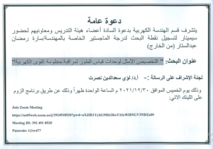 يتشرف قسم الهندسة الكهربية بدعوة السادة أعضاء هيئة التدريس ومعاونيهم لحضور سيمينار لتسجيل نقطة البحث الخاصة بالمهندسة / سارة رمضان عبدالستار (من الخارج)