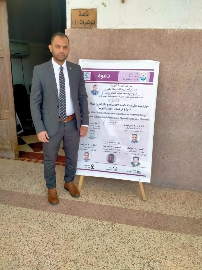 يسر قسم الهندسة الكهربية دعوتكم لحضور مناقشة رسالة الدكتوراه المهندس\ محمد عبدالله عبدالله موس بعنوان (خوازميات مثلى متعددة الاهداف لمنح نظام تخزين الطاقة )