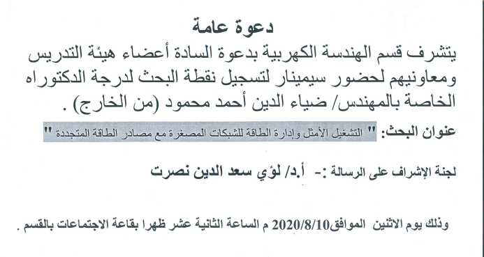 يتشرف قسم الهندسة الكهربية بدعوة السادة أعضاء هيئة التدريس ومعاونيهم لحضور سيمينار لتسجيل نقطة البحث لدرجة الدكتوراه الخاصة بالمهندس/ ضياء الدين أحمد محمود (من الخارج ) ، وذلك يوم الاثنين الموافق10/8/2020 م الساعة الثانية عشر ظهرا بقاعة الاجتماعات بالقسم