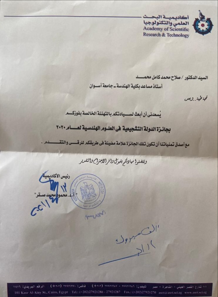 يهنئ عميد كلية الهندسة الأستاذ الدكتور/ لؤي سعد الدين نصرت للدكتور صلاح كامل الأستاذ المساعد بقسم الهندسة الكهربية وذلك لحصوله علي جائزة الدولة التشجيعية.