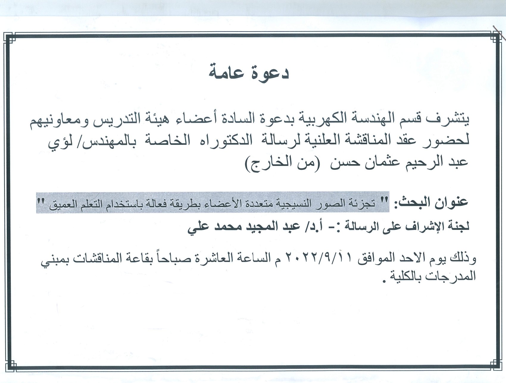 يتشرف قسم الهندسة الكهربية بدعوة السادة أعضاء هيئة التدريس ومعاونيهم لحضور عقد المناقشة العلنية لرسالة الدكتوراه الخاصة بالمهندس/لؤي عبد الرحيم عثمان حسن (من الخارج).