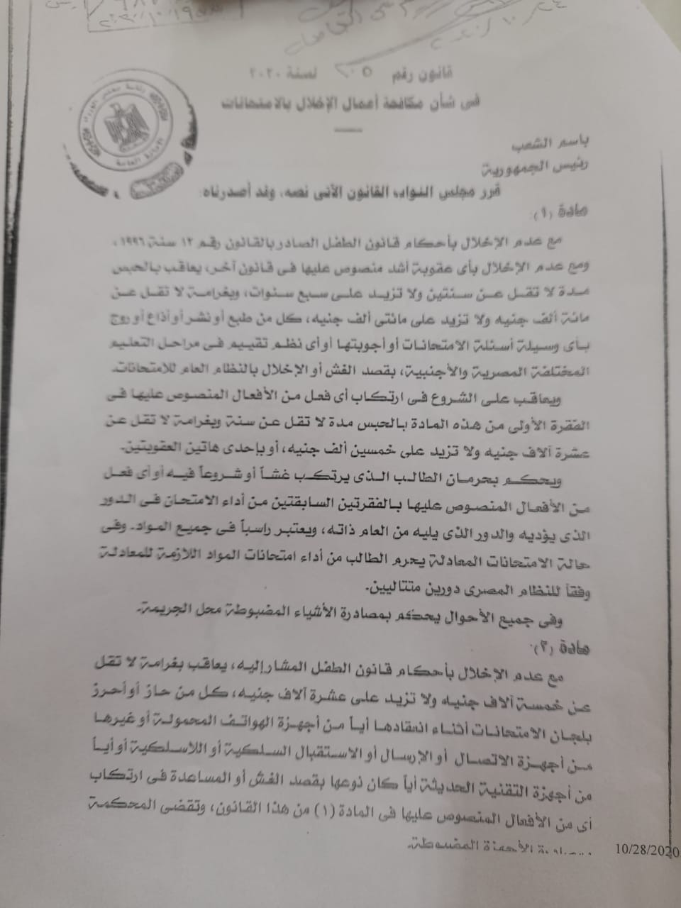 ١- سوف يطبق هذا القانون بداية من الامتحان القادم الأحد 28 فبراير.