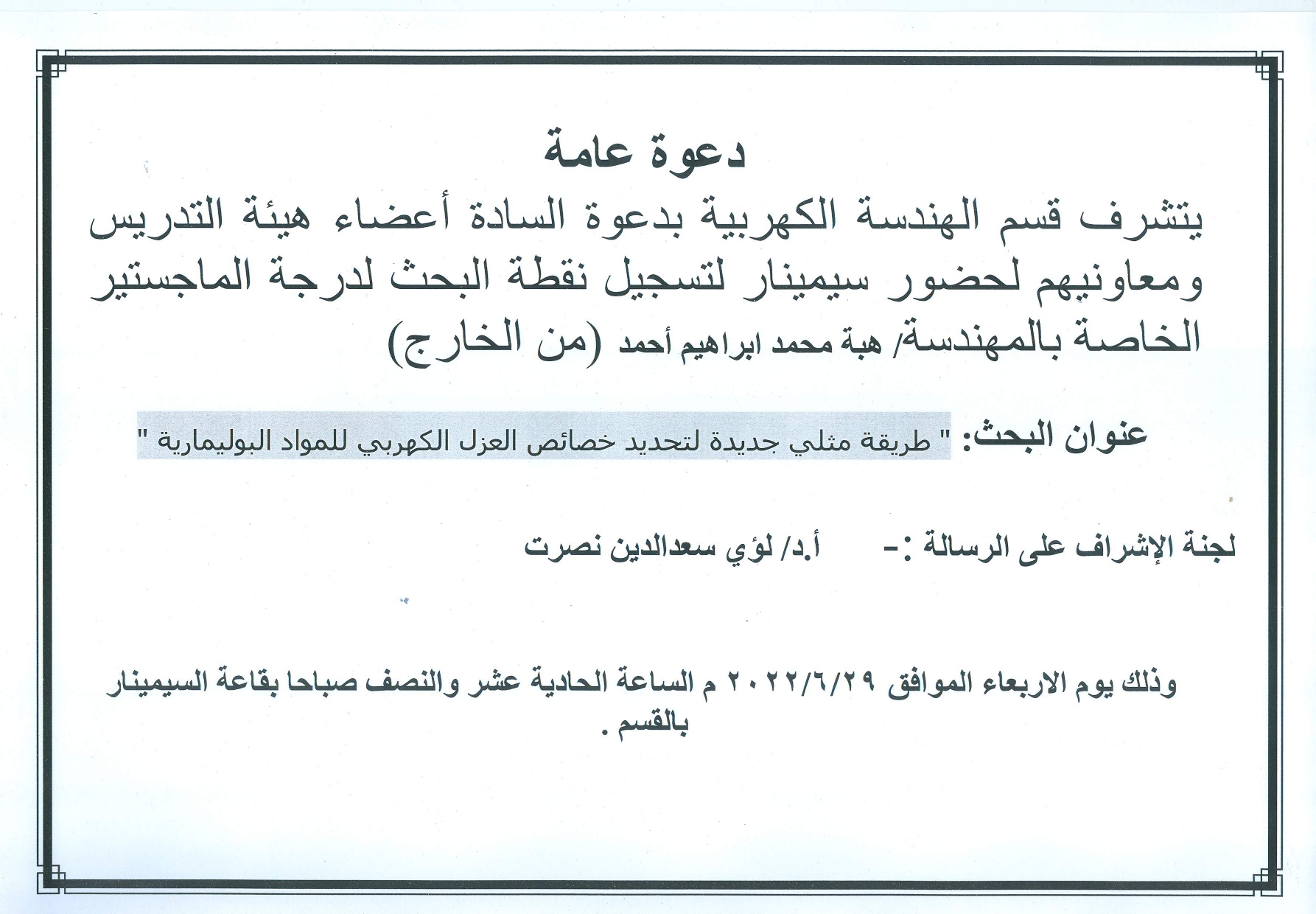 يتشرف قسم الهندسة الكهربية بدعوة السادة أعضاء هيئة التدريس ومعاونيهم لحضور سيمينار لتسجيل نقطة البحث لدرجة الماجستير الخاصة بالمهندسة/ هبة محمد ابراهيم أحمد  (من الخارج)