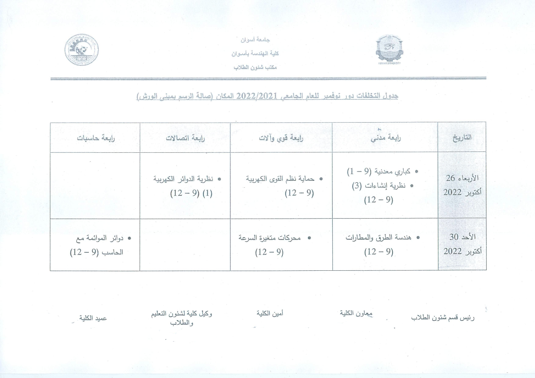 جدول إمتحانات دور نوفمبر 2022/2021By nagwa / October 11, 2022 يعلن قطاع شئون طلاب كلية الهندسة جدول إمتحانات دور نوفمبر 2022/2021 جدول التخلفات