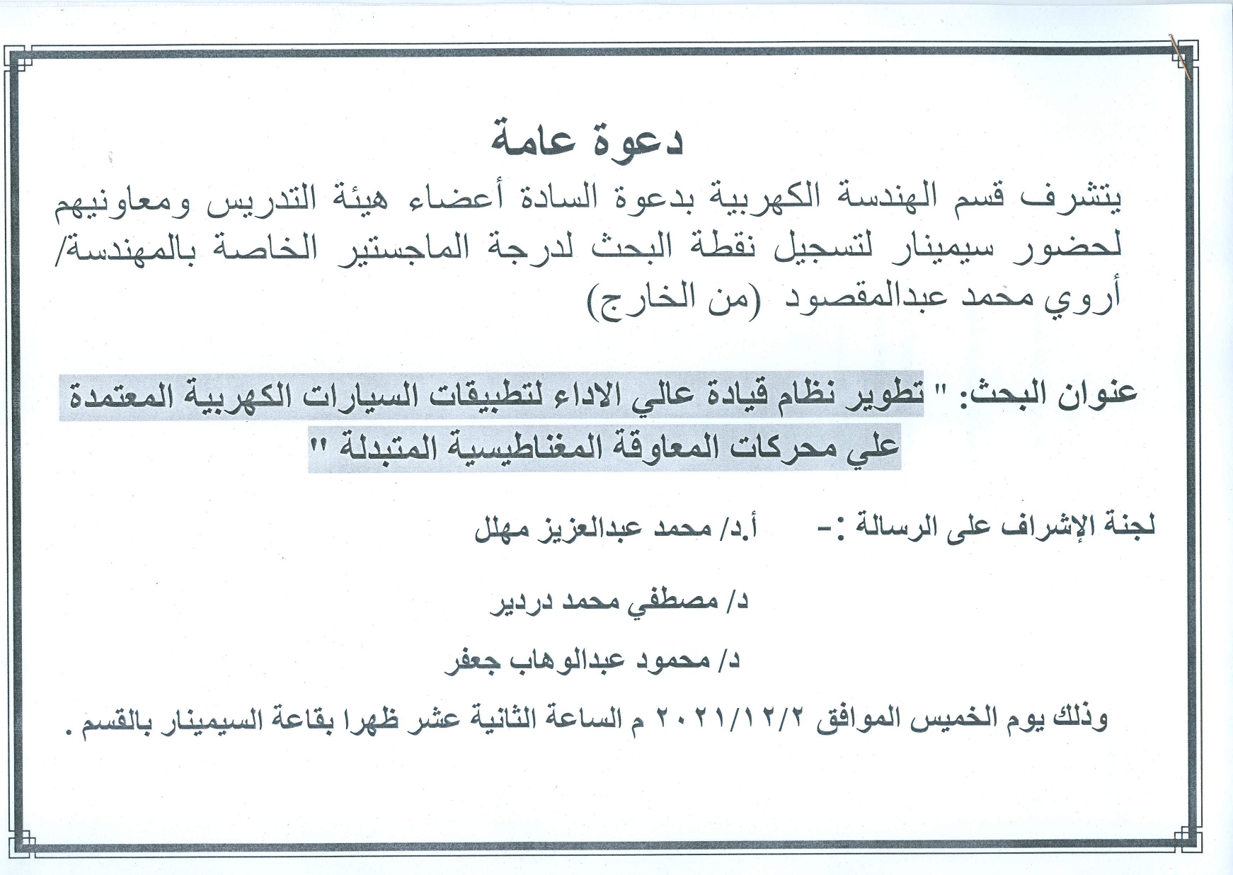 يتشرف قسم الهندسة الكهربية بدعوة السادة أعضاء هيئة التدريس ومعاونيهم لحضور سيمينار لتسجيل نقطة البحث لدرجة الماجستير الخاصة بالمهندسة/ أروي محمد عبدالمقصود (من الخارج)