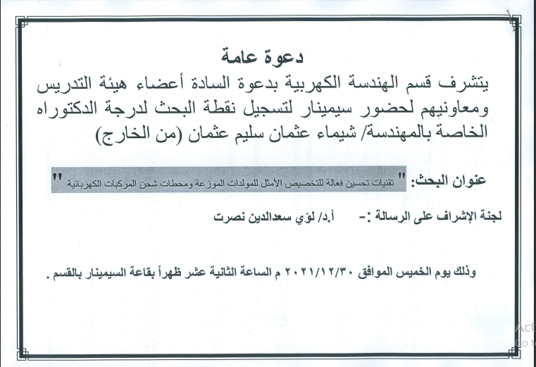 يتشرف قسم الهندسة الكهربية بدعوة السادة أعضاء هيئة التدريس ومعاونيهم لحضور سيمينار لتسجيل نقطة البحث لدرجة الدكتوراه الخاصة بالمهندسة/ شيماء عثمان سليم عثمان (من الخارج) .