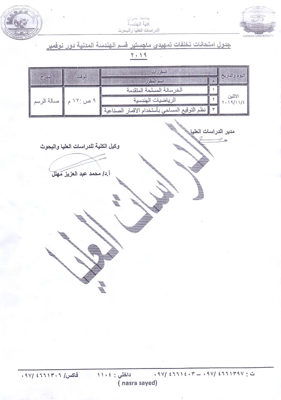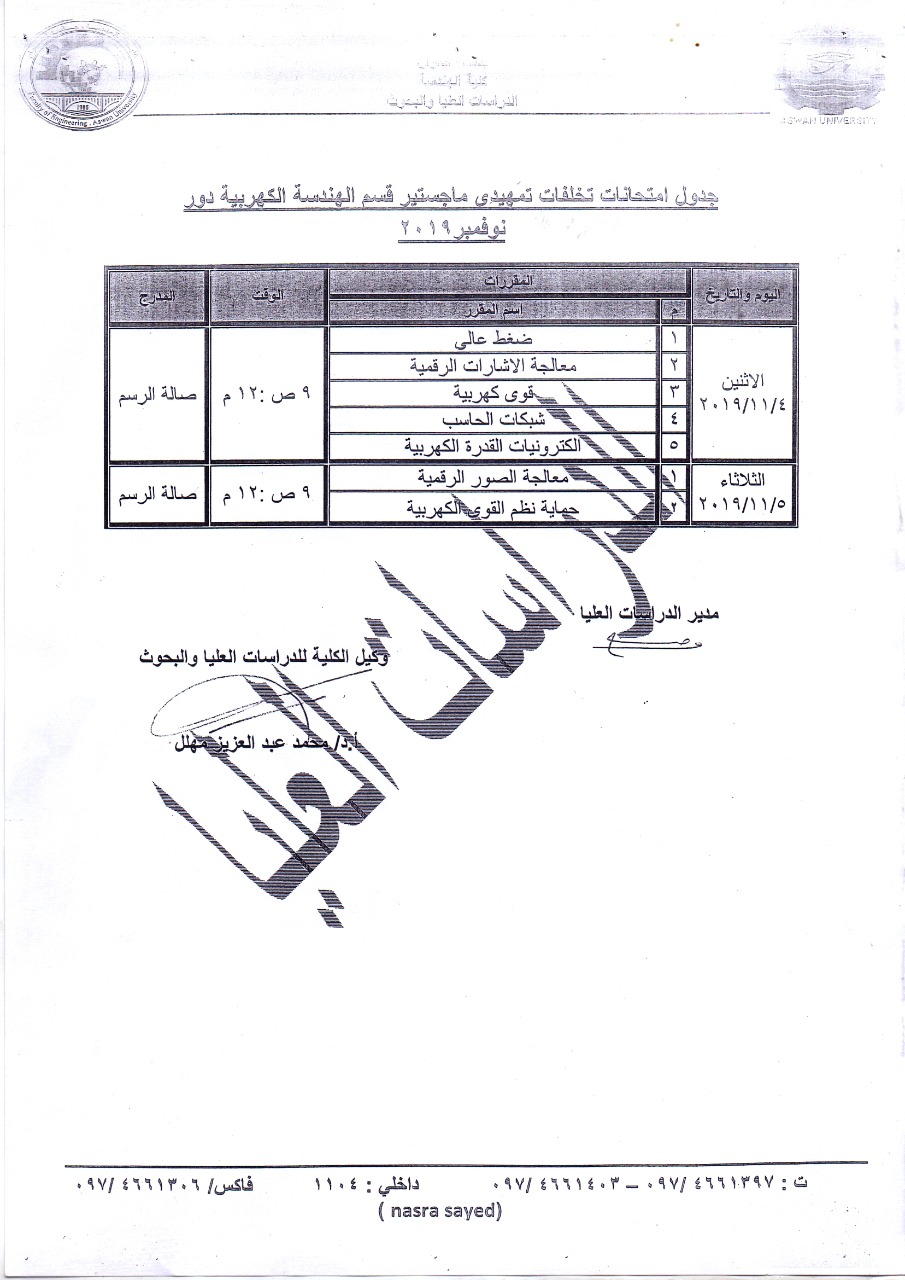 تـم الإعــــلان عن جـدول اِمتحانات تخلفـات تمهيدى ماجستير لقسمين ( قسـم الهندسة الكهربية – قسم الهندسة المدنية ) لـدور نوفمبر 2019.