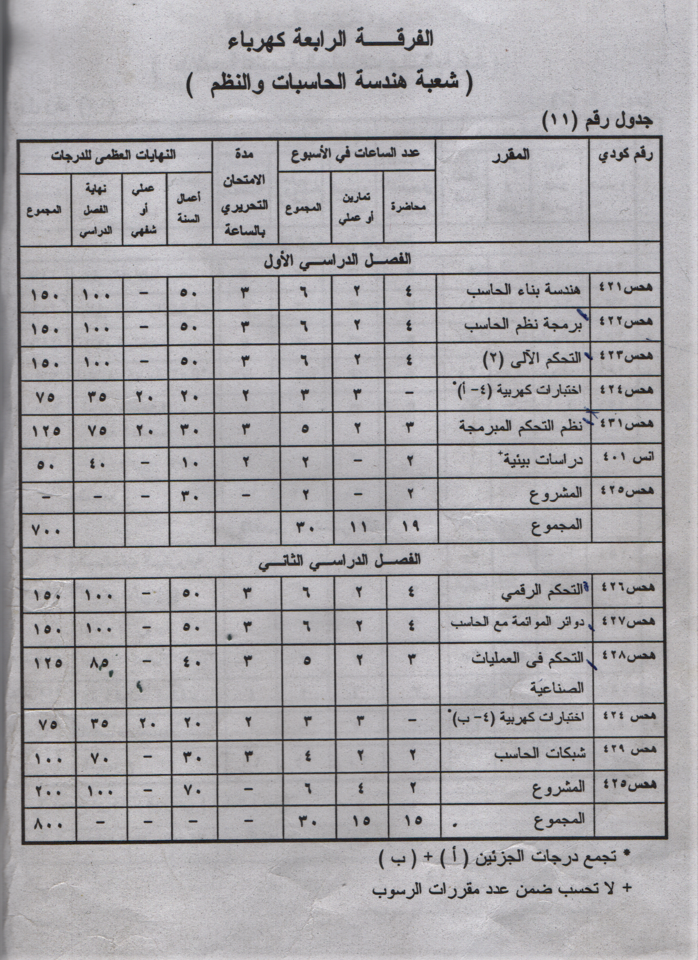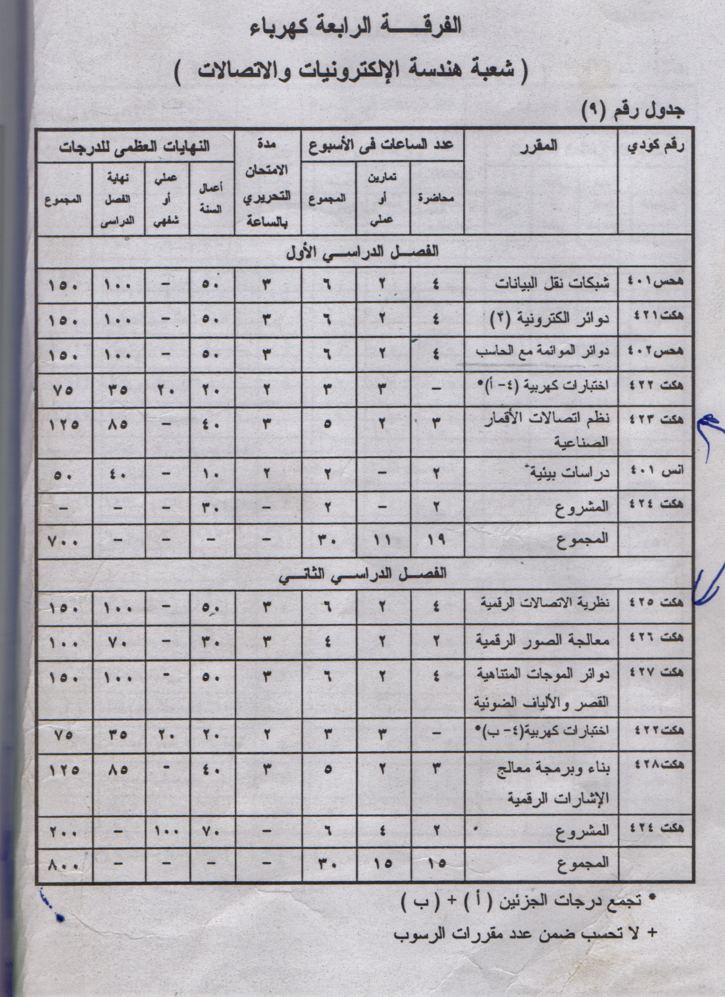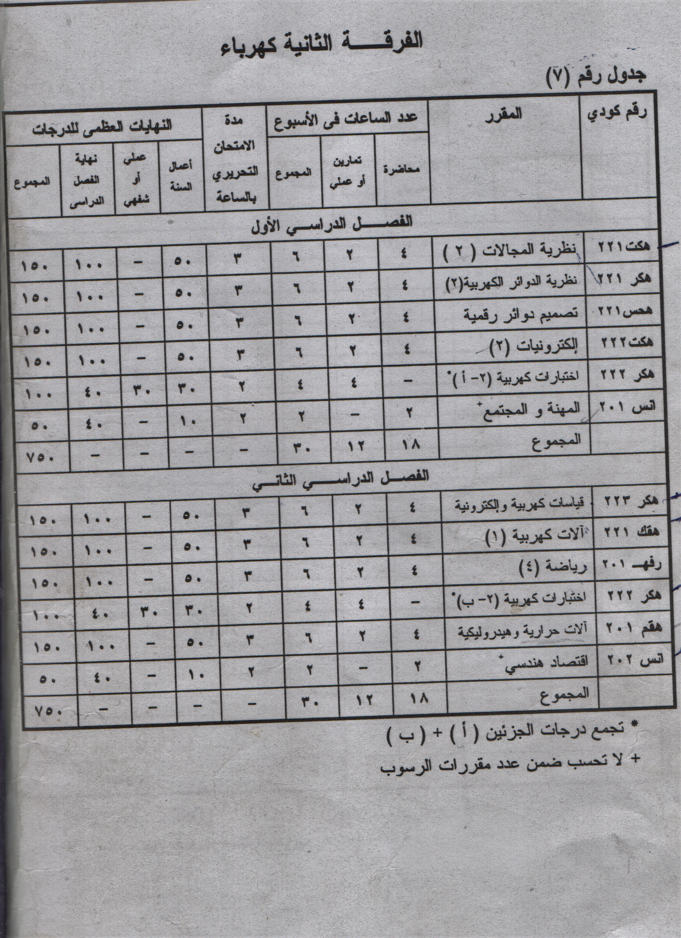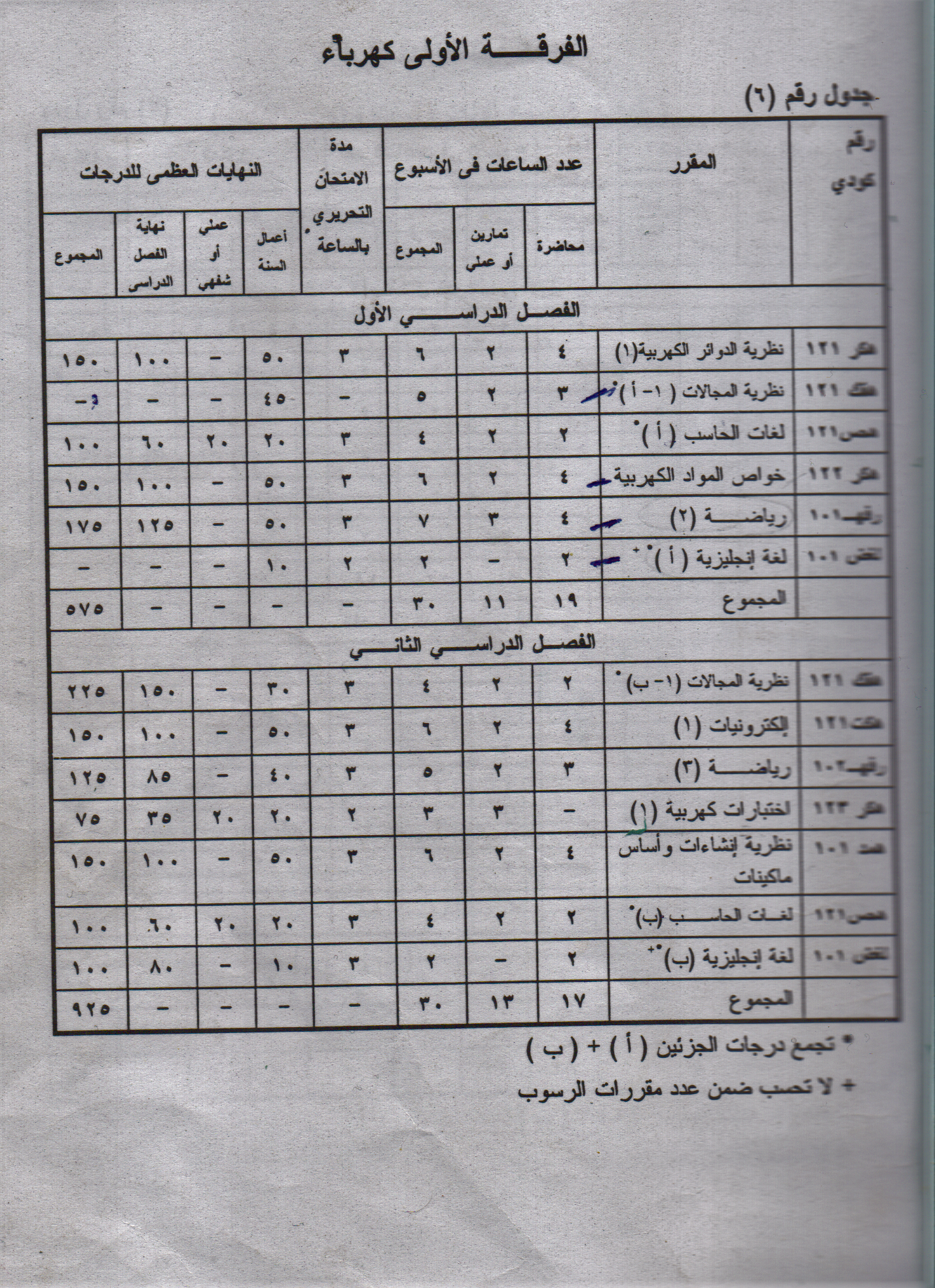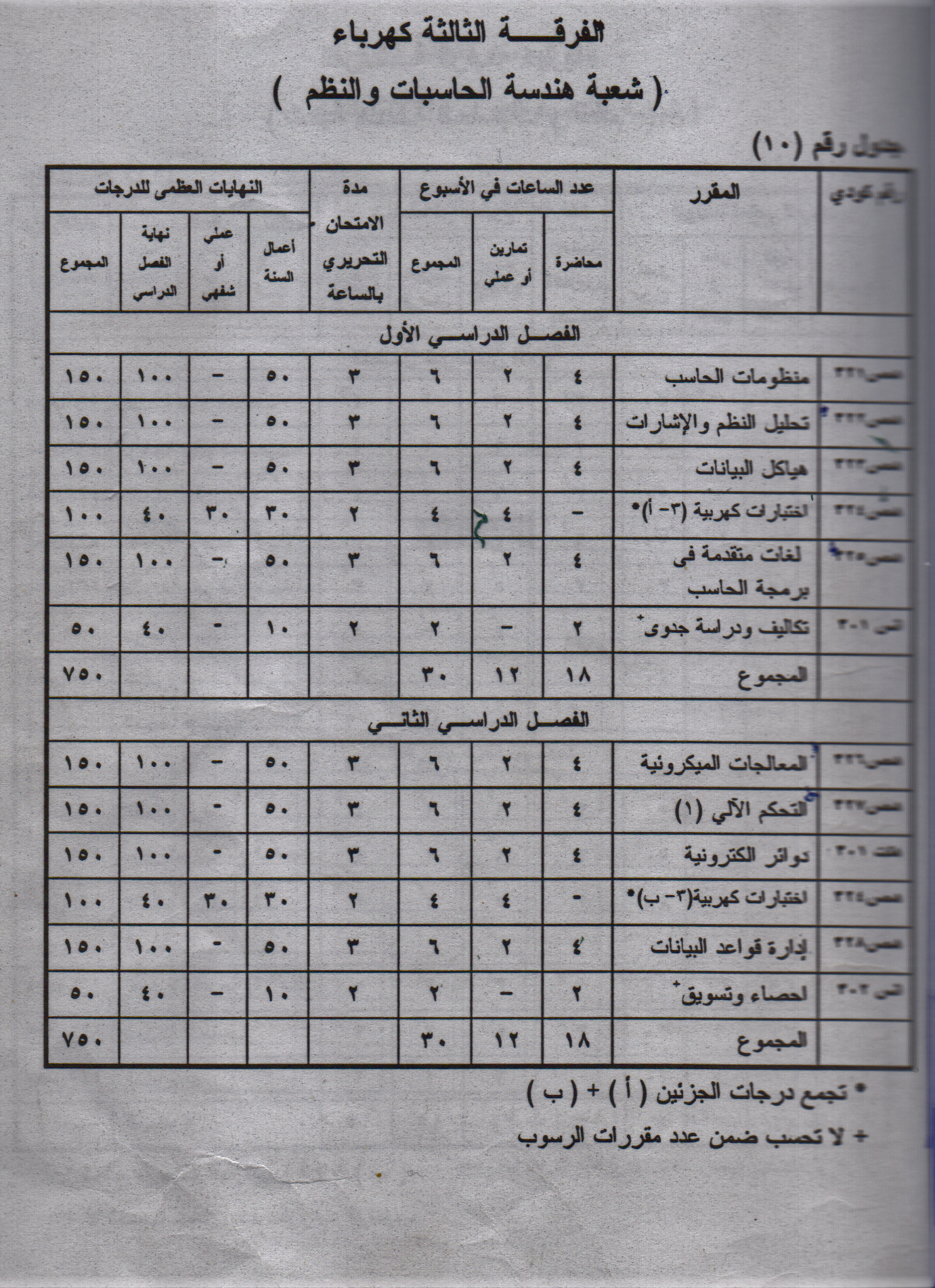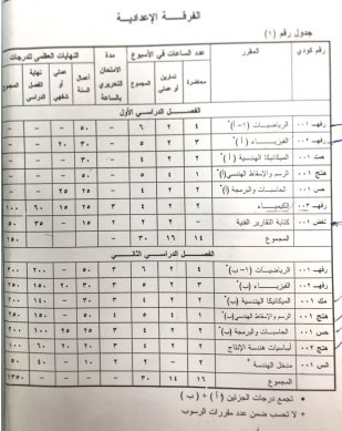 ♦ توزيع المقررات الدراسية وساعتها ودرجات الامتحان :