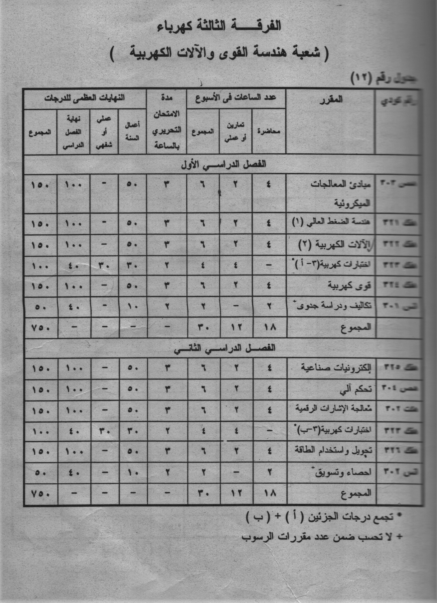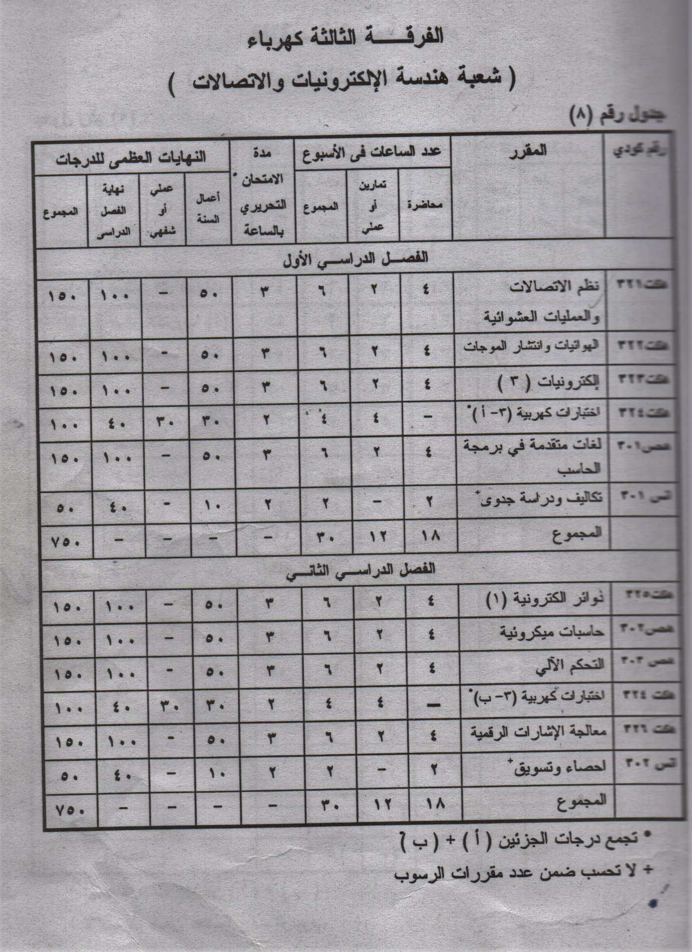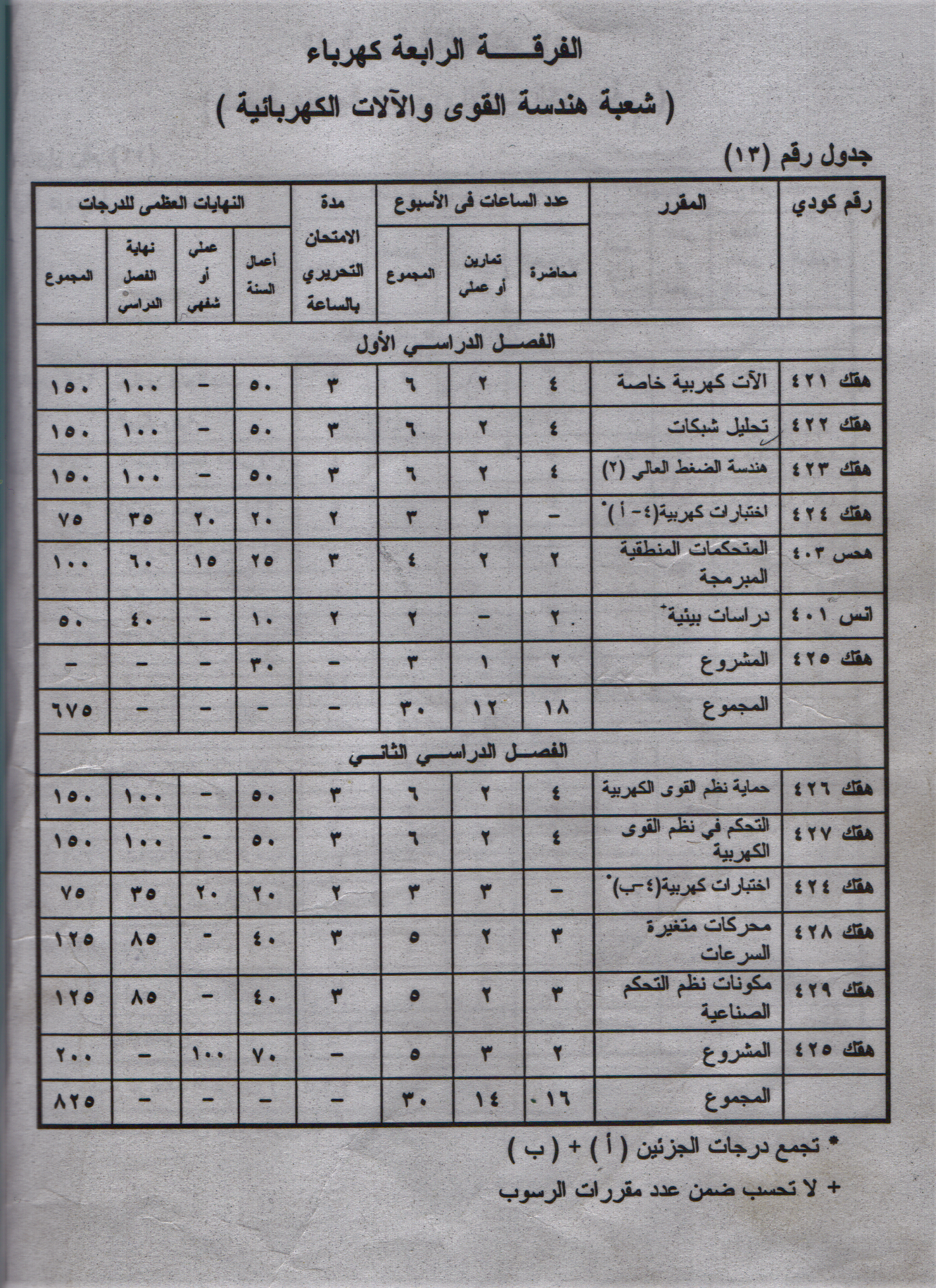 “الحاسبات والبرمجة، نظرية الدوائر الكهربية، نظرية المجالات، لغات الحاسب، خواص المواد الكهربائية، إلكترونيات، اختبارات كهربية، تصميم دوائر رقمية، قياسات كهربية وإلكترونية، آلات كهربية، نظم الاتصالات والعمليات العشوائية، الهوائيات وانتشار الموجات، لغات متقدمة في برمجة الحاسب، حاسبات ميكروئية، معالجة الإشارات الرقمية، شبكات نقل البيانات، دوائر المواءمة مع الحاسب، نظم اتصالات الأقمار الصناعية، نظرية الاتصالات الرقمية، الاتصالات اللاسلكية، دوائر الموجات المتناهية القصر والألياف الضوئية، بناء وبرمجة معالج الإشارات الرقمية، منظومات الحاسب، تحليل النظم والإشارات، هياكل البيانات، المعالجات الميكروئية، التحكم الآلي، دوائر الكترونية إدارة قواعد البيانات، هندسة بناء الحاسب، برمجة نظم الحاسب، المتحكمات المنطقية المبرمجة، التحكم الرقمي، التحكم في العمليات الصناعية، شبكات الحاسب، هندسة الضغط العالي، إلكترونيات صناعية، قوى كهربية، تحويل واستخدام الطاقة، تحليل شبكات، آلات كهربية خاصة، المتحكمات المنطقية المبرمجة، حماية نظم القوى الكهربية، التحكم في نظم القوى الكهربية، محركات متغيرة السرعة، مكونات نظم التحكم الصناعية، المشروع”