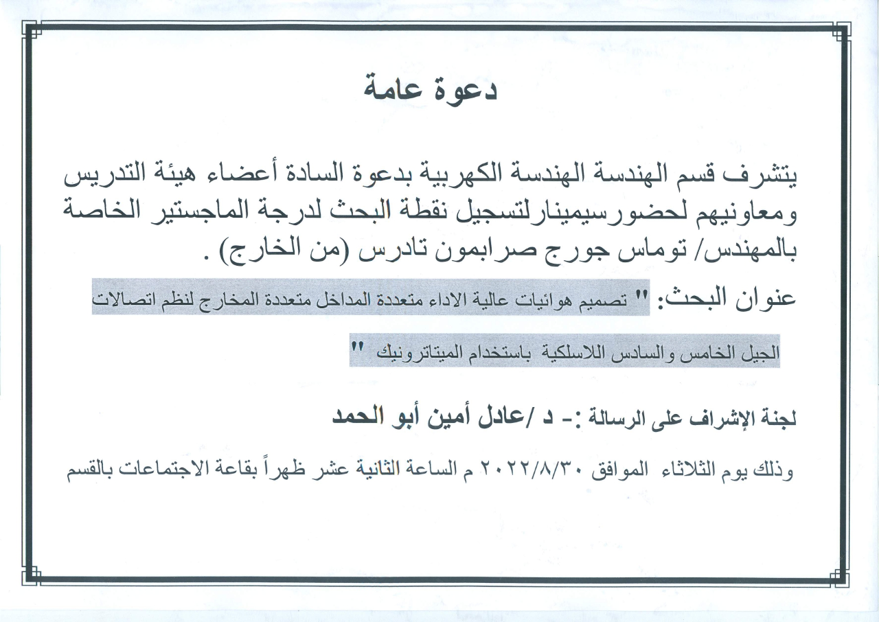 يتشرف قسم الهندسة الكهربية  بدعوة السادة أعضاء هيئة التدريس ومعاونيهم  لحضور سيمينار لتسجيل نقطة البحث لدرجة الماجستير الخاص  بالمهندس/توماس جورج صرابمون تادرس  (من الخارج).