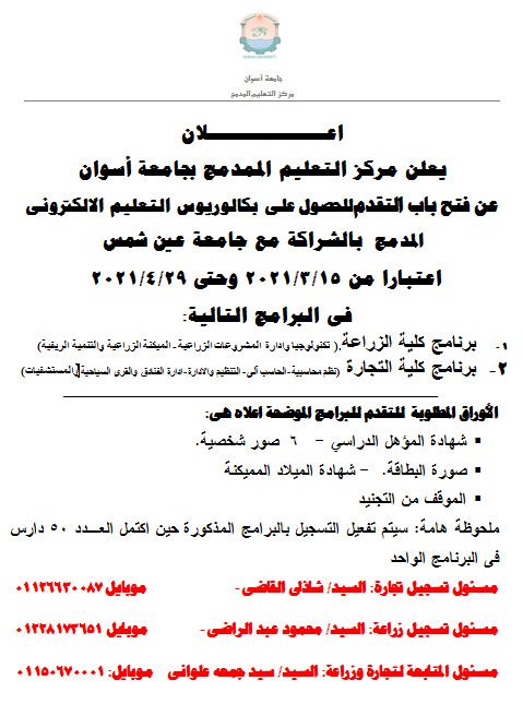 يعلن مركز التعليم المدمج بجامعة أسوان عن فتح باب التقديم للحصول علي بكالوريوس التعليم الإلكتروني المدمجBy nagwa / March 10, 2021