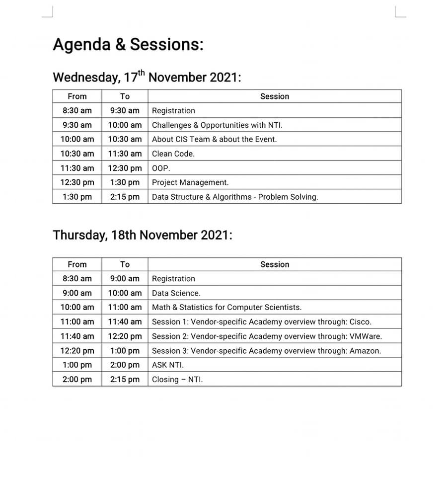 لو عاوز تتعرف أكتر على إحتياجات سوق العمل من خلاله وإزاي تقدر تأهل نفسك وتستعد للبداية ، يبقى انتظرونا يومي الأربعاء والخميس 17 و 18 نوفمبر 2021 بفرع المعهد القومي للاتصالات “بمركز إبداع مصر الرقمية Creativa” بجامعة المنصورة ،هنكون معاكم مع نخبة من خبراء المعهد القومي للاتصالات ونخبة من كبرى الشركات العالمية في تكنولوجيا المعلومات في مصر والوطن العربي: Amazon و VMware وCisco.